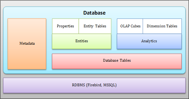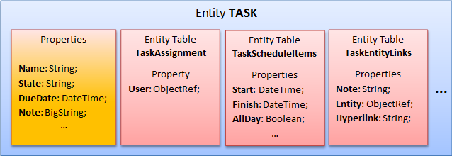 Entity is a fundamental unit of the database. It has Properties and can aggregate Entity Tables which also have their Properties, ex.: